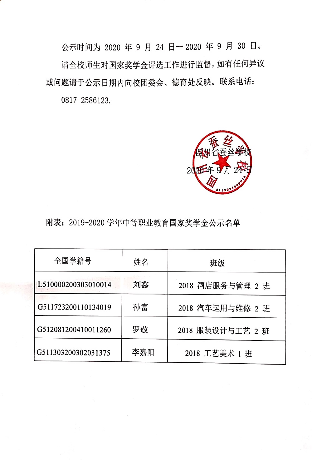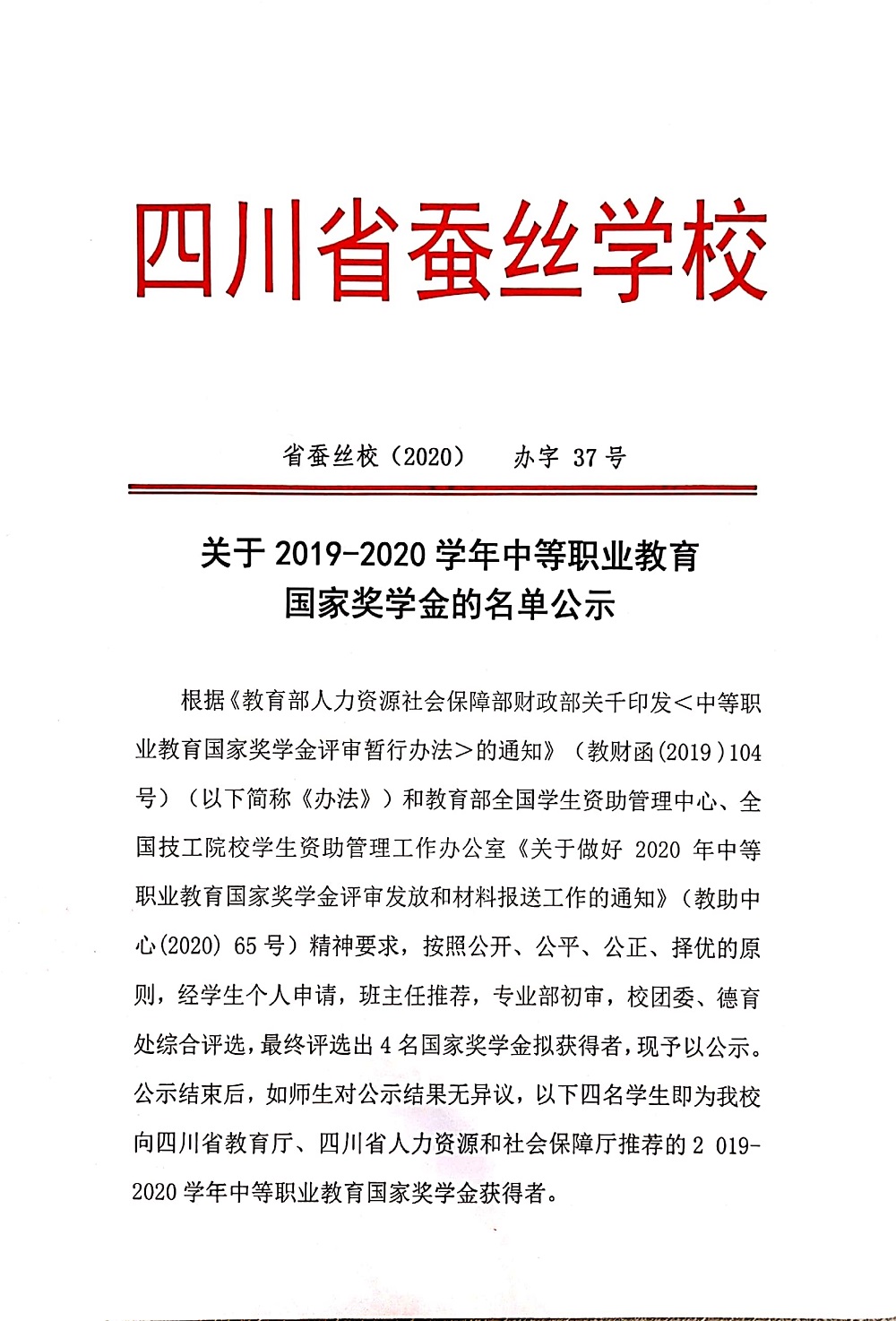 关于2019-2020学年中等职业教育国家奖学金的名单公示