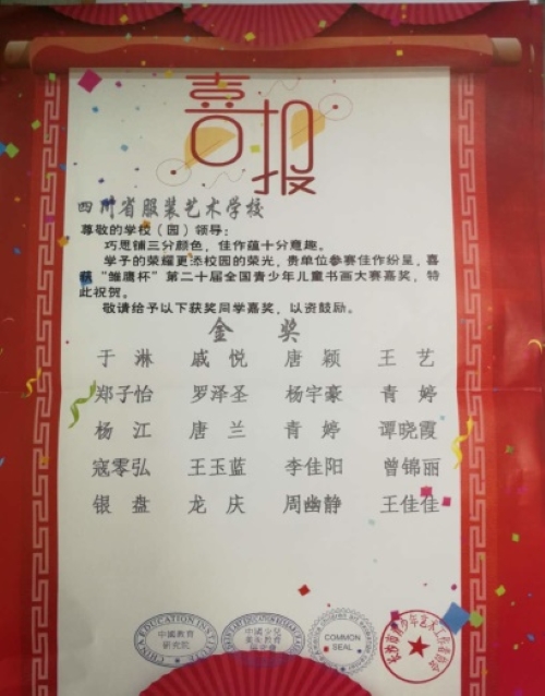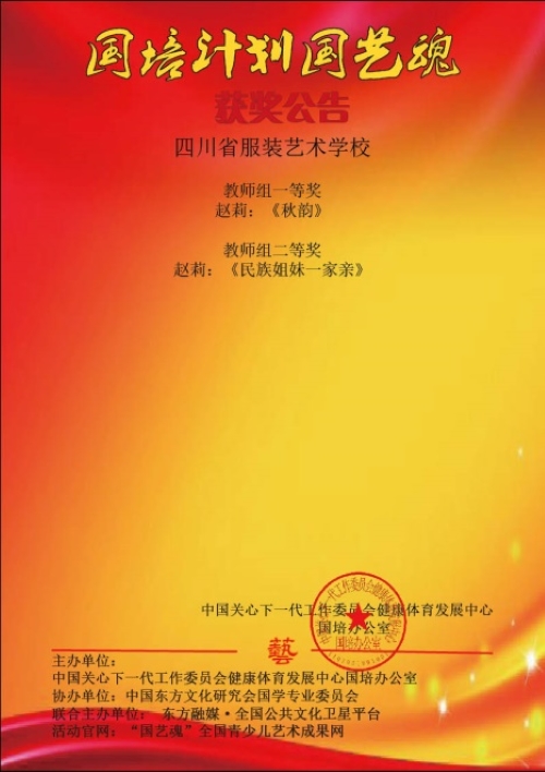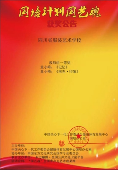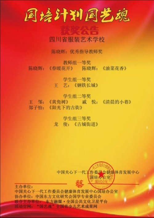 在我校工艺美术部师生的共同努力下,“雏鹰杯”全国书画大赛获得金奖20个,银奖12个,铜奖4个。7位老师荣获“全国优秀书画教师”称号。“国培计划国艺魂”艺术展演活动学生组获得一等奖9个,二等奖8个,三等奖2个。教师组获得一等奖6个,二等奖1个。具体获奖名单如下: