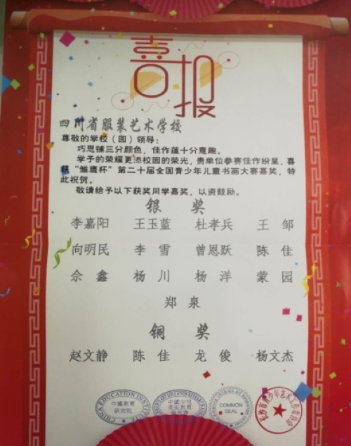 近日,第二十届“雏鹰杯”全国青少年书画大赛及2019年“国培计划国艺魂”艺术展演活动圆满结束。“雏鹰杯”全国青少年书画大赛由中国教育研究院、中国少儿美术教育研究会、中美少儿美术教育交流中心、长沙市青少年艺术工作者协会主办,溢美活动组委会承办。“国培计划国艺魂”艺术展演活动由中国关心下一代工作委员会主办,中国中央电视台展播。在参赛过程中学生大胆进行专业创作,提高了专业技能,丰富了课余生活。深入贯彻落实党的19大精神和《中共中央关于繁荣发展社会主义文艺的意见》精神。以中国梦为时代主题,以中华优秀传统文化为根脉,以创新为动力,以创作生产优秀作品为中心环节,展示我校艺术教育的丰硕成果,营造健康高雅的艺术教育大环境,推进艺术教育改革发展的优势和作用。