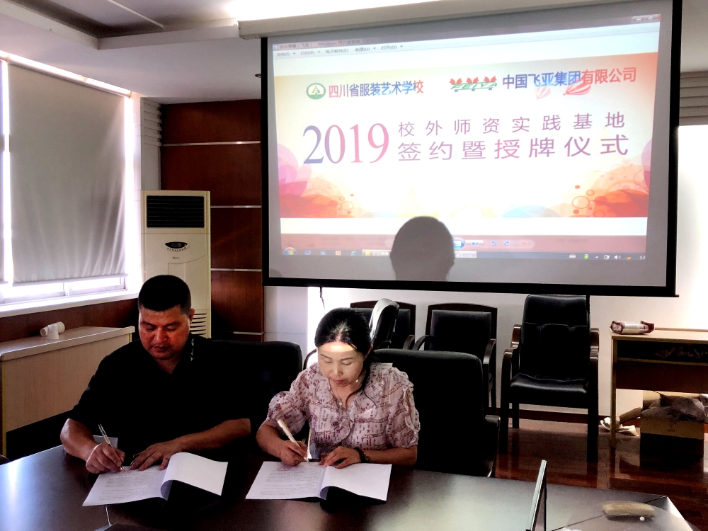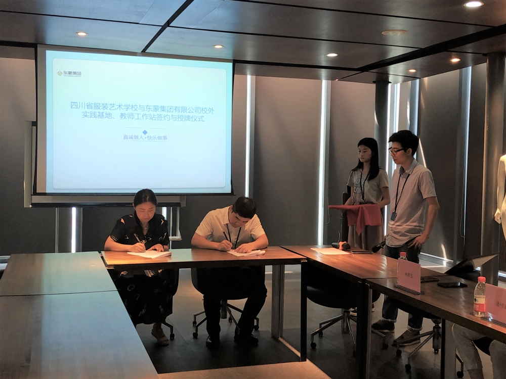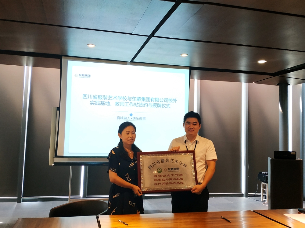 随后叶部长和王建友先生进行了《校企合作师资培养协议》及《校企共建教师工作站协议》的签订,并向东蒙集团授予“四川省服装艺术学校教师企业工作站、校外师资实践基地”的牌匾。
