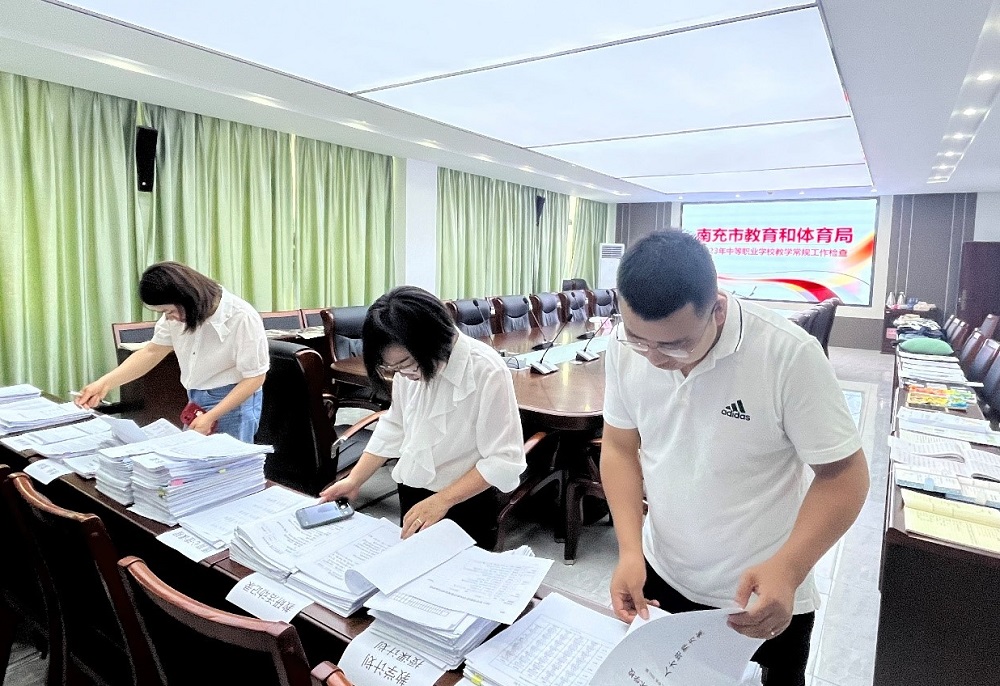 为进一步加强职业学校教育教学常规管理,促进教师专业水平的提高,保障学生德、智、体、美、劳全面健康成长。4月20日下午,南充市教育和体育局职教工作检查组税文婷、张姝和刘小俊三位老师到我校进行教学常规工作检查。本次检查工作主要围绕三个方面:学校实施性教学计划执行情况;学校教学常规工作“六认真”开展情况;学校一、二年级学生学籍管理情况。