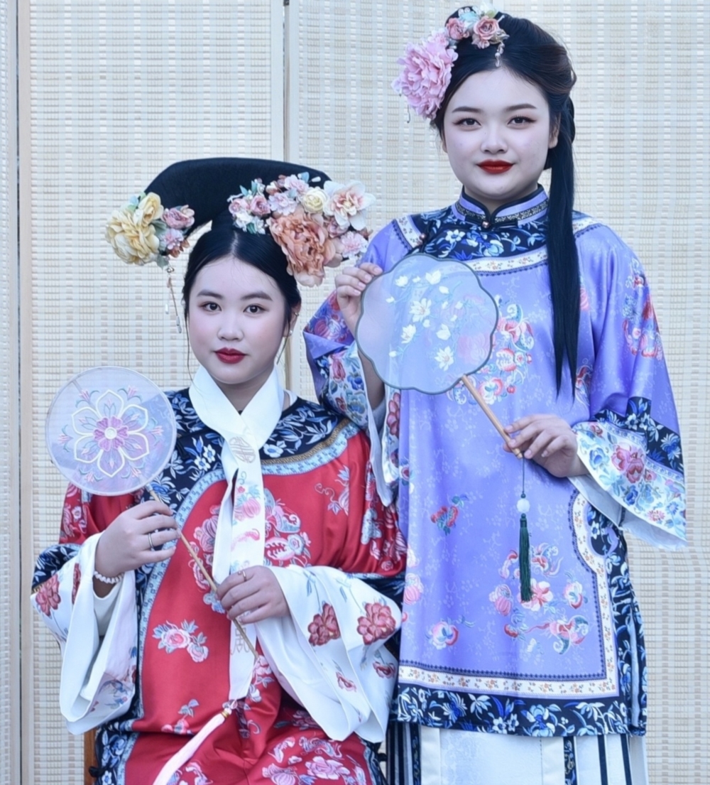 留学生在我校沈康老师指导下试穿不同式样旗袍,并搭配团扇、簪花等配饰;